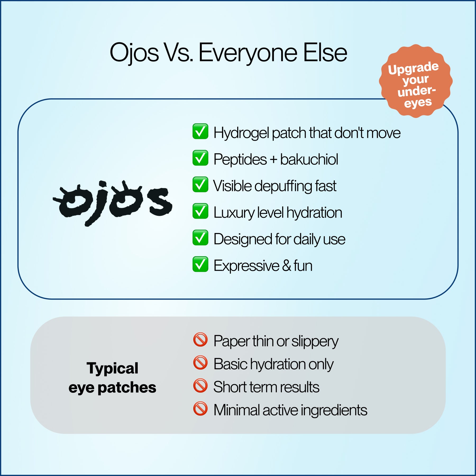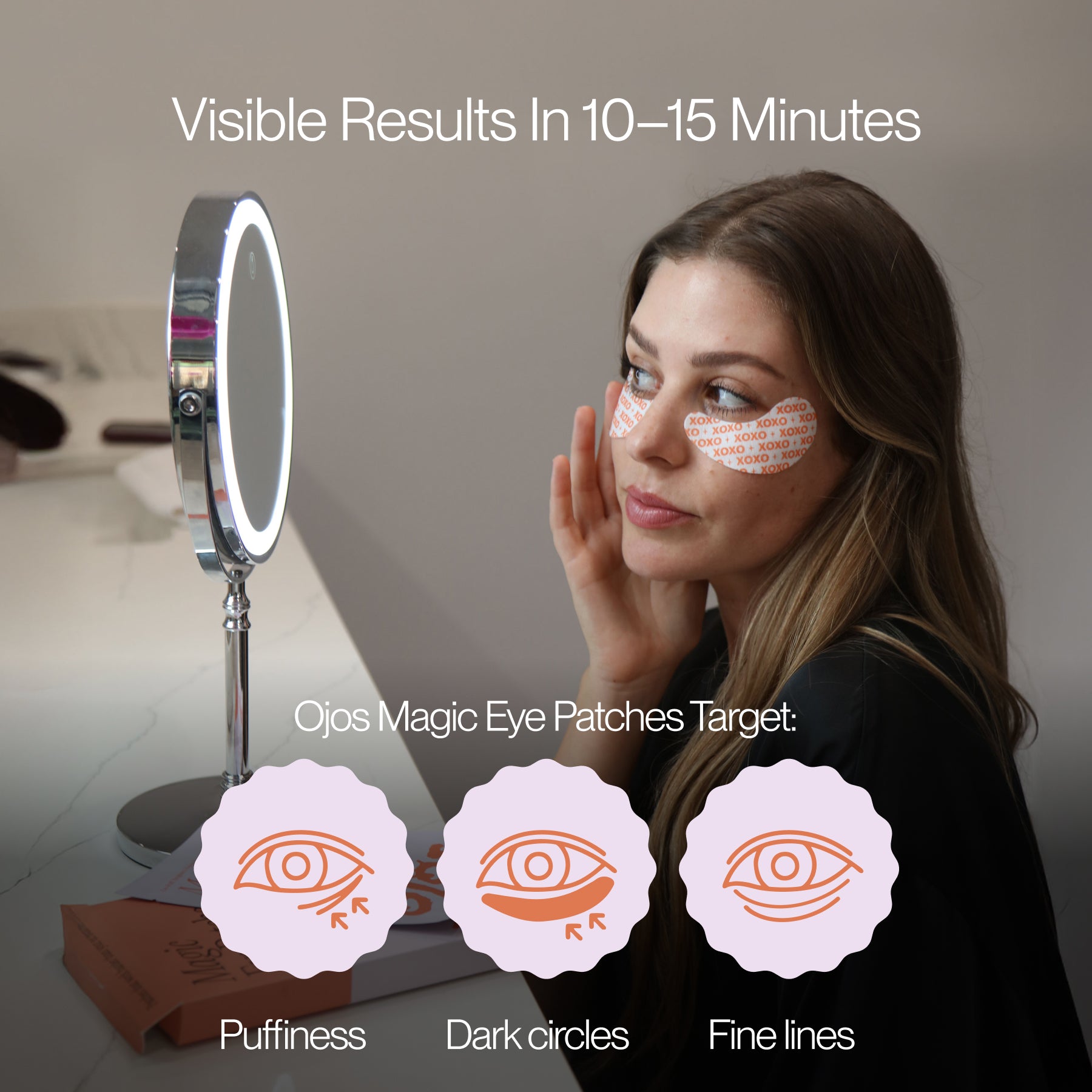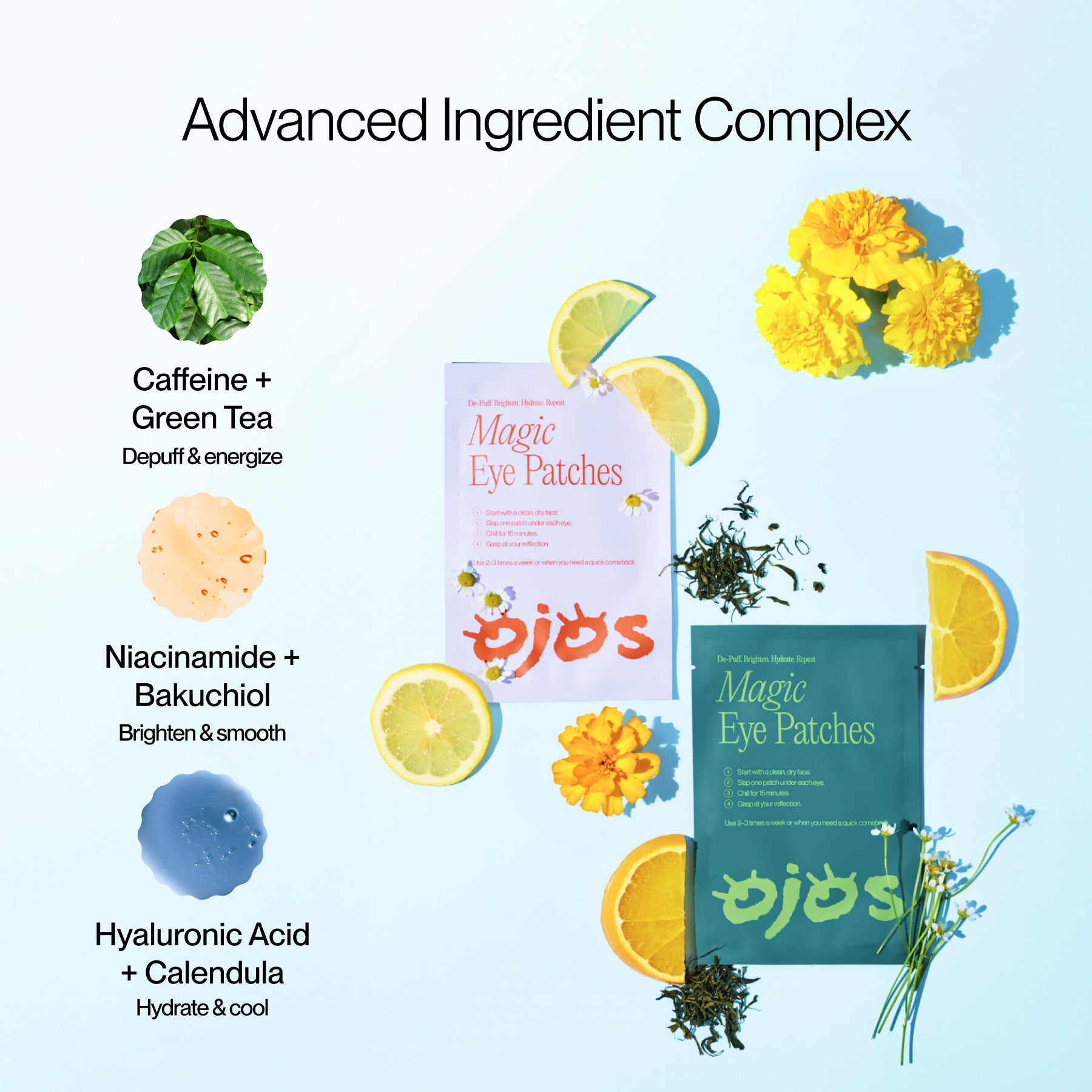 Each box includes 8 pairs of ojos magic eye patches packed with a blend of natural extracts, bioactive peptides, brighteners, and hydrators. Helps visibly reduce dark circles, puffiness, and fine lines.